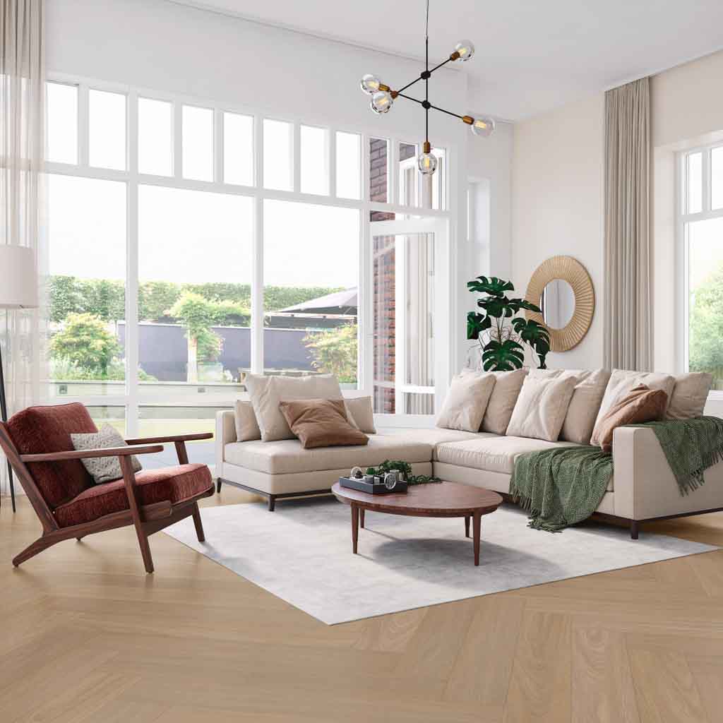 De Vivafloors 7870 is een prachtige pvc-vloer die bij uitstek geschikt is voor het leggen in visgraat. Dit geeft een prachtige basis in uw interieur. Met een totale dikte van 2,50 mm en een toplaagdikte van 0,55 mm is de kwaliteit gegarandeerd. De Vivafloors 7870 heeft een matte uitstraling en micro groeven aan 4 zijden van de plank. Daarbij is de vloer geschikt voor zowel vloerverwarming als koeling. Tevens kunt u ervoor kiezen om een rand langs de vloer te leggen, dit brengt wel extra kosten met zich mee. De prijs in het offerte aanvraag systeem is de prijs inclusief leggen, 2-3 mm egaliseren en lijm. De vloeren worden door ons eigen stoffeerdersteam vakkundig gelegd. U heeft dus nergens omkijken naar. Vraag vrijblijvend een offerte aan of neem contact met ons op voor het bespreken van de mogelijkheden.